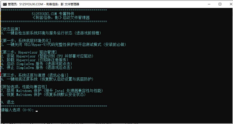 2. 再次运行 1刺客信条:影 启动文件管理器.bat 输入键盘上 “2” 回车 , 安装 Hypervisor (智能识别 AMD/Intel 驱动并部署)